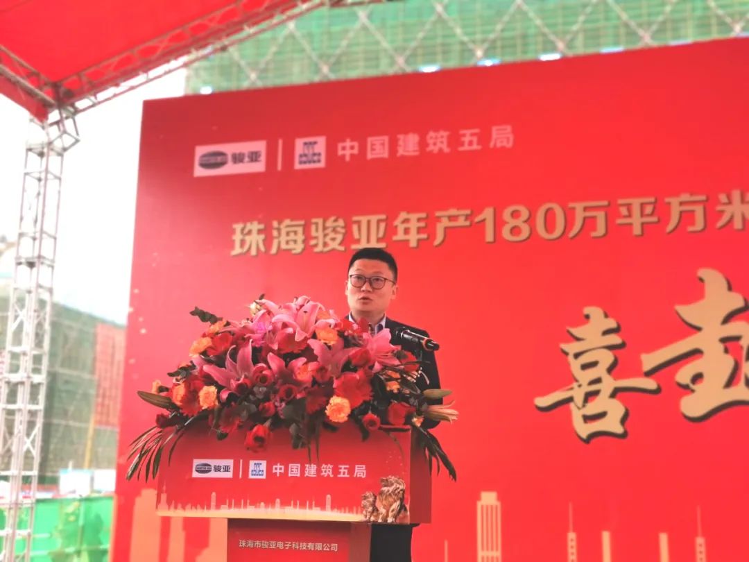 广东骏亚董事长、总经理叶晓彬先生表示:珠海骏亚项目是广东骏亚的重点建设项目,一期封顶标志着广东骏亚在珠海生产基地的建设取得阶段性重要成果,希望全体参建人员再接再厉,进一步把好质量关,加强安全管理和质量管理、加快施工进度,确保珠海骏亚项目整体工程早日投产,早日为推进珠海的经济和社会发展贡献一份力量。
