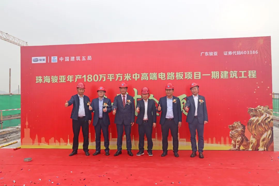 彩旗招展高朋到,礼炮声中高楼起。4月20日,珠海骏亚年产180万平方米中高端电路板项目一期建筑工程主体正式封顶,来自广东骏亚、珠海骏亚、珠海市富山工业园管理委员会和中建五局三公司的领导出席了本次封顶仪式,共同见证了这一重要时刻。